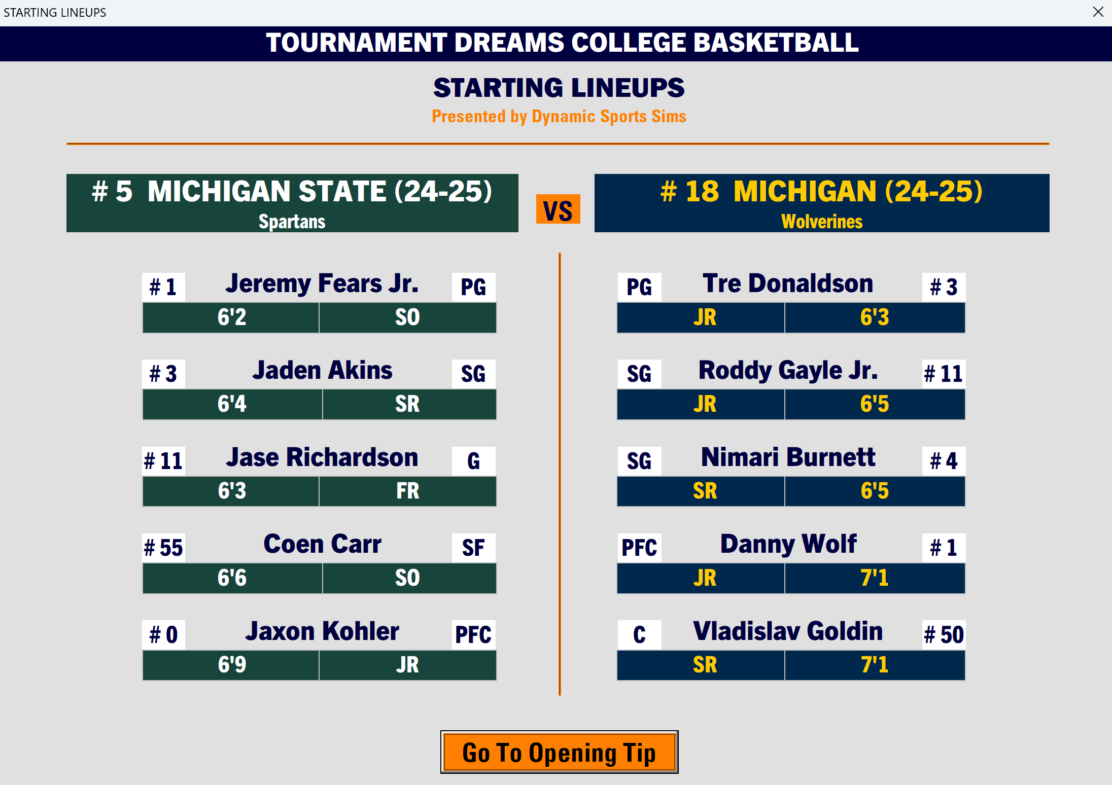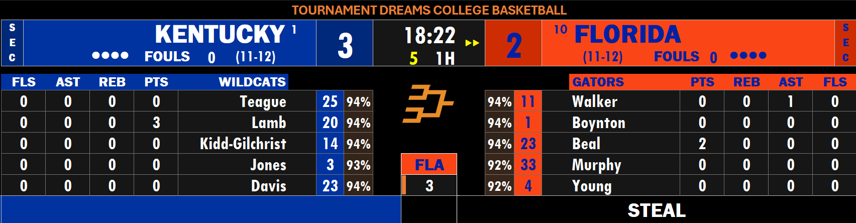 Tournament Dreams College Basketball (TDCB) is a dynamic, play-by-play basketball simulation that captures the drama, depth, and passion of college basketball like never before. This immersive game lets you experience the thrill of watching real college teams and players compete in high-level simulation matchups — all driven by a powerful analytics-driven game engine.